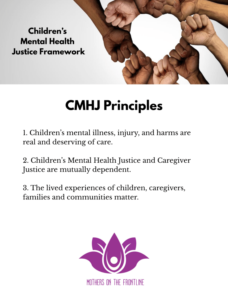 The Children’s Mental Health Justice Framework was developed by Mothers on the Frontline to identity and transform harms to the safety, health, and wellbeing of children, caregivers, and their families. These resources will familiarize you will the CMHJ Principles and ways to apply them to your home and community.